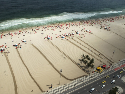 E a coisa tá tão quente que o carioca já colocou a criatividade para funcionar, fez uma 'nesgas' na areia molhou para poder chegar na areia ainda com a sola do pé, que a areia está tão quente que se ele bobear ela fica na areia.