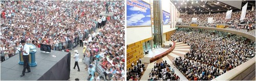 Os templos, suntuosos, o primeiro(E) lotado de Valdemiro Santiago, o segundo(D) de Edir Macedo